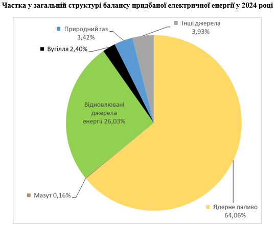 Інформація щодо частки кожного джерела енергії, яка була використана у загальній структурі балансу купленої та/або виробленої електричної енергії на власних електроустановках та вплив на навколишнє середовище, спричинений таким виробництвом електроенергії (питомі показники викидів CO2 та радіоактивне забруднення), за 2024 рік.